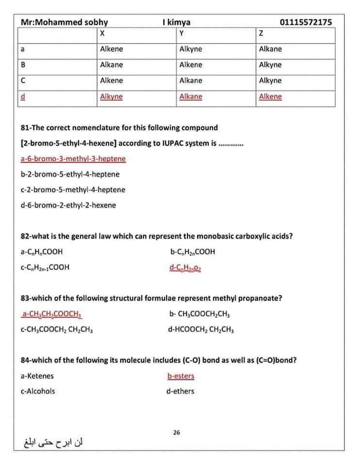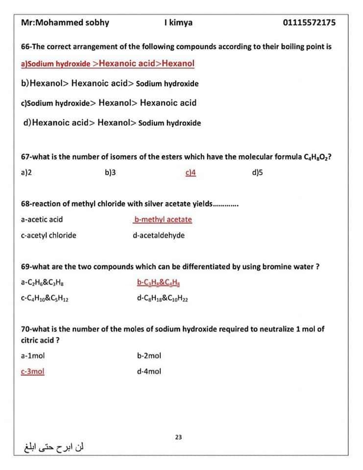 وفيما يلي يقدم "كشكول" الأسئلة المتوقعة في الكيمياء للثانوية العامة 2024 ضمن مراجعة ليلة الامتحان لطلاب الصف الثالث الثانوي: