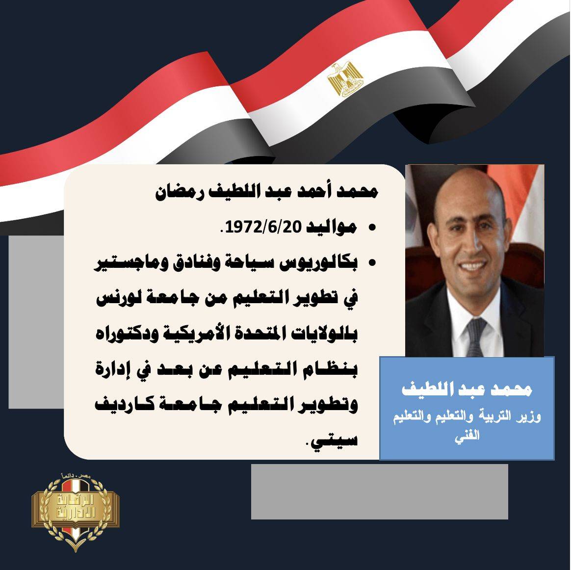 ونشرت صفحة هيئة الرقابة الإدارية على "فيس بوك"، الجمعة، السير الذاتية لوزراء الحكومة الجديدة، وتضمنت حصول وزير التربية والتعليم على بكالوريوس السياحة والفنادق، والماجستير في «تطوير التعليم» من جامعة لورنس بالولايات المتحدة، والدكتوراه بنظام التعليم عن بُعد في إدارة وتطوير التعليم من جامعة كاردف سيتي.