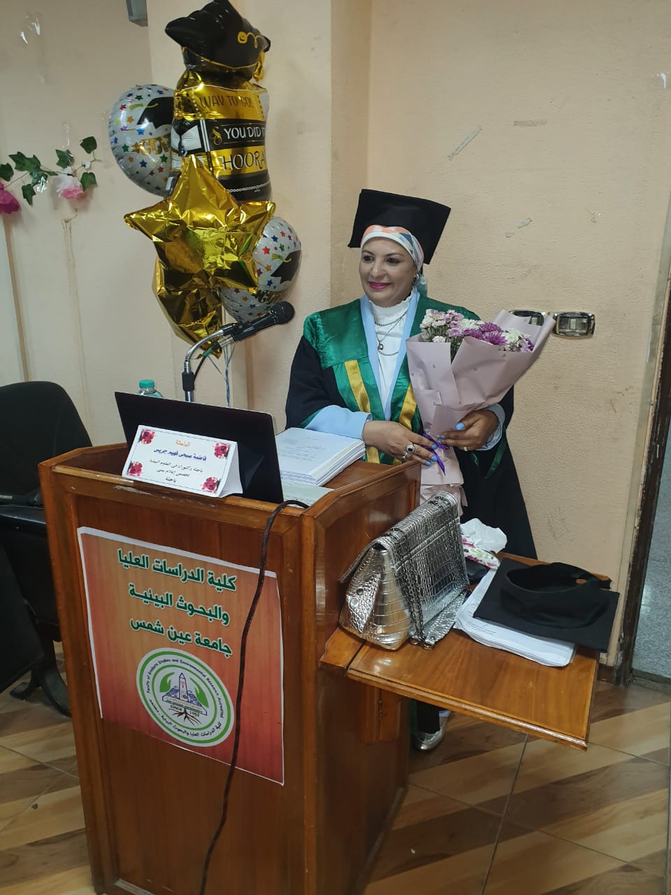 الاستاذ الدكتور ريهام رفعت محمد عبدالعال استاذ التربية البيئية بقسم العلوم التربوية والإعلام البيئي ووكيل الكلية للدراسات العليا والبحوث والقائم بعمل عميد كلية الدراسات العليا والبحوث البيئية مناقشًا وعضوًا.