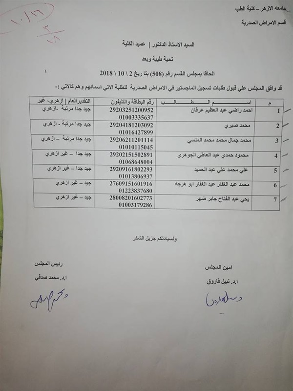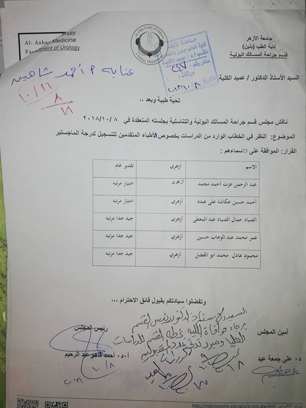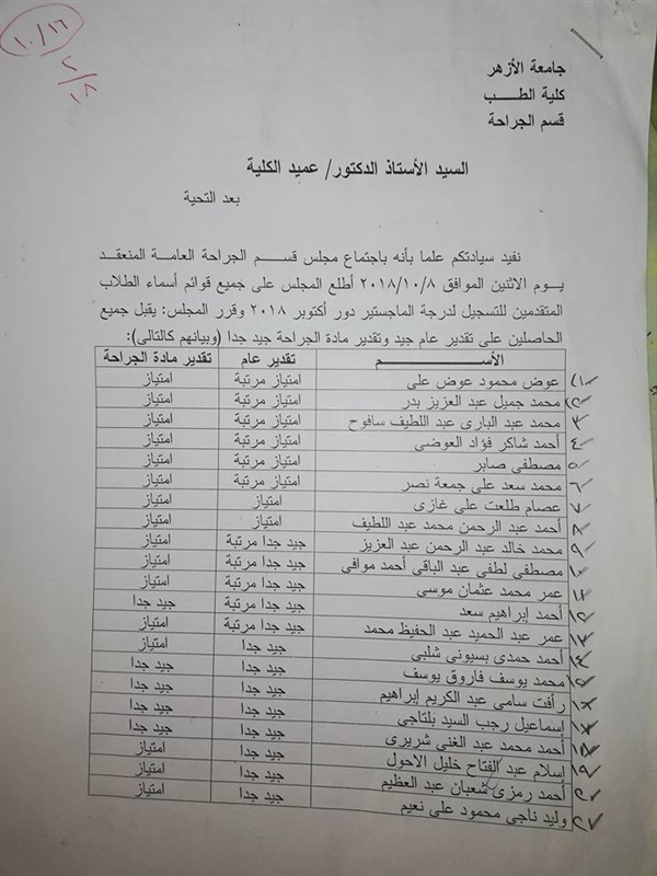 أعلنت كلية الطب للبنين، بجامعة الأزهر، فرع مدينة نصر، أسماء الأطباء الذين تم قبولهم في الماجستير "الجراحة والصدريه وأشعه ت والمسالك البولية"