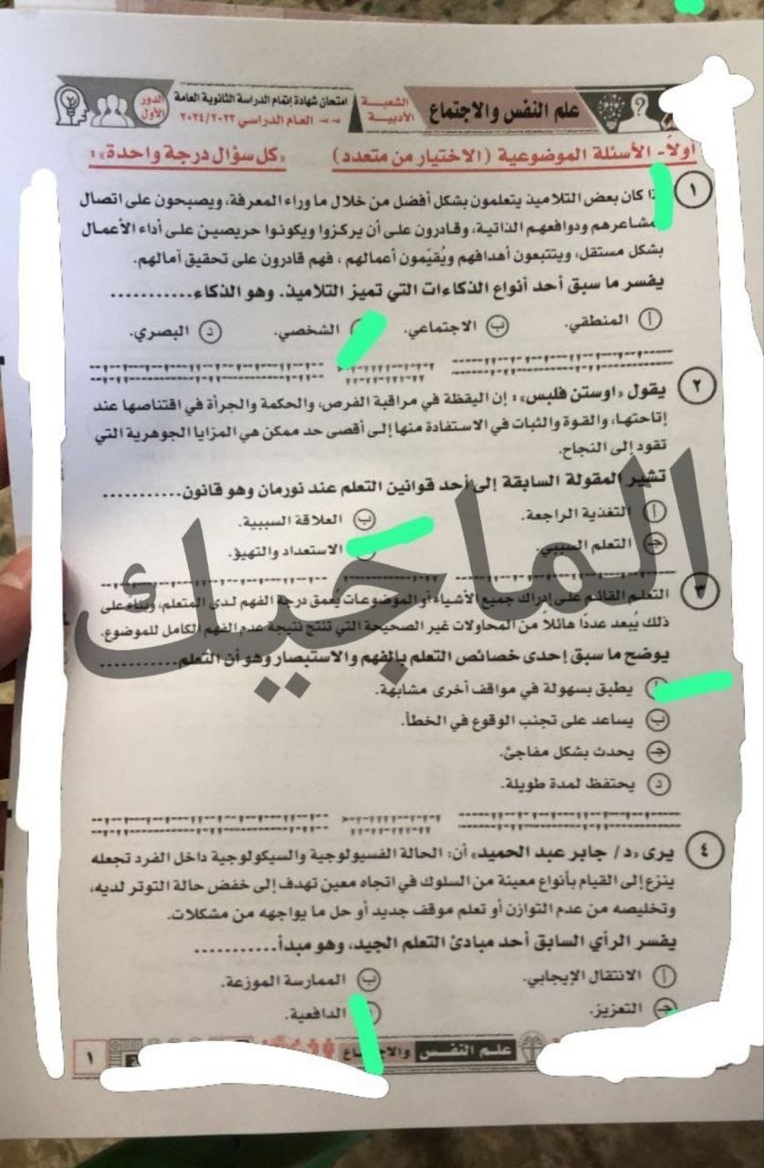- حل امتحان علم النفس والاجتماع ثانوية عامة 2024
