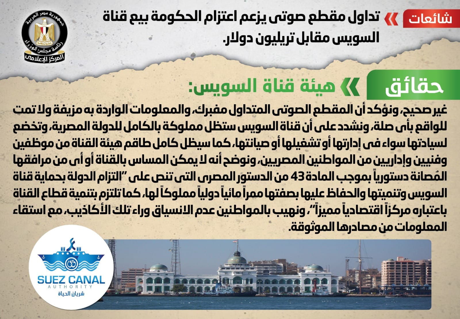 وقد قام المركز الإعلامي لمجلس الوزراء بالتواصل مع هيئة قناة السويس، والتي نفت تلك الأنباء، مُؤكدةً أنه لا صحة لاعتزام الحكومة بيع قناة السويس مقابل تريليون دولار، وأن المقطع الصوتي المتداول مفبرك، والمعلومات الواردة به مزيفة ولا تمت للواقع بأي صلة.