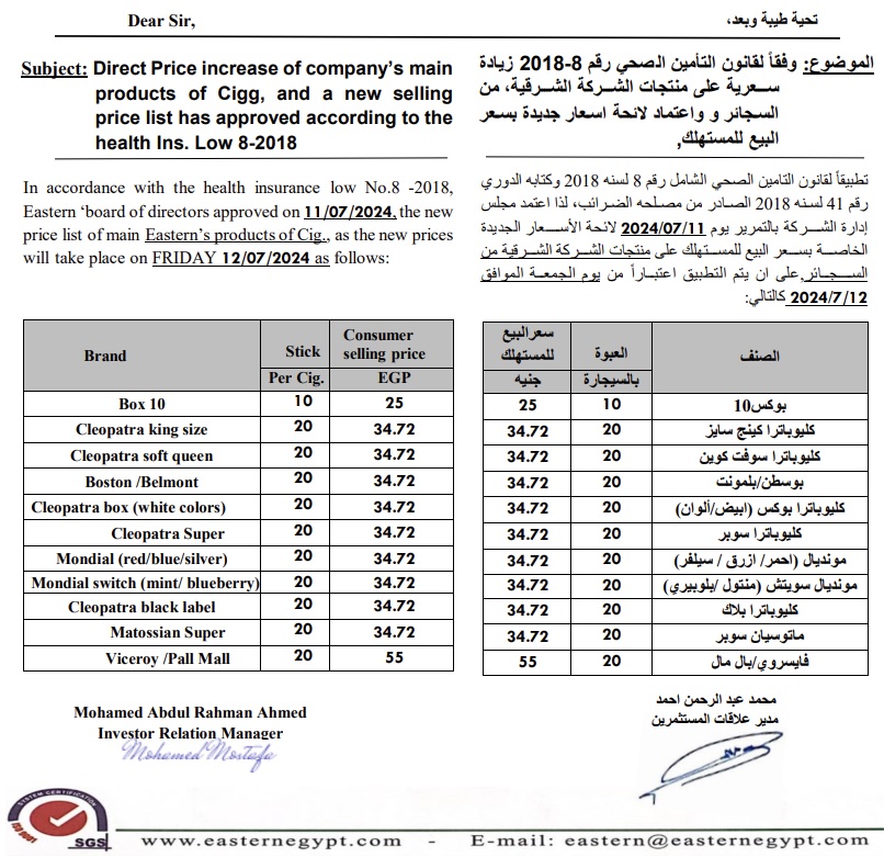 وتعد هذه الزيادة الثالثة لأسعار منتجات إيسترن كومباني خلال 2024، حيث أعلنت الشركة عن زيادتين في فبراير وأبريل الماضيين.