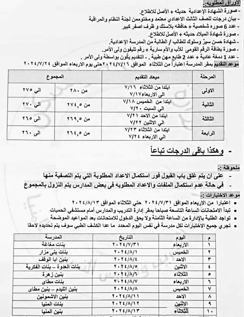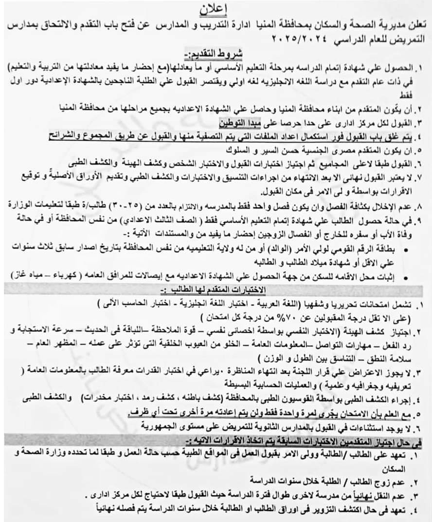 أعلن اللواء عماد كدواني محافظ المنيا، عن فتح باب القبول بمدارس الثانوية الفنية للتمريض، للعام الدراسي 2024/ 2025 بدءًا من بعد غد الثلاثاء 16/7/2024 وحتى الأربعاء 24/7/2024، فى 12 مدرسة ( بنين - بنات) على مستوى المحافظة.