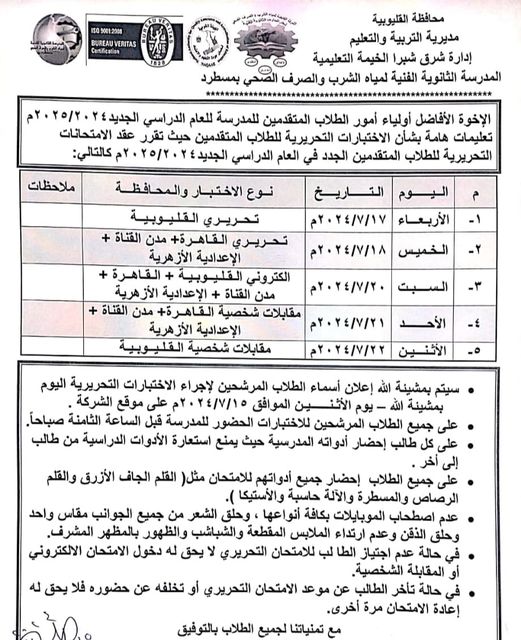 أوضحت المدرسة الثانوية الفنية لمياه الشرب والصرف الصحي بمسطرد عدة تعليمات لأولياء الأمور والطلاب المتقدمين لها للعام الدراسي الجديد ٢٠٢٥/٢٠٢٤، بشأن الاختبارات التحريرية.