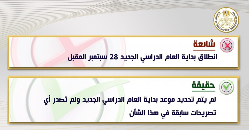 ردت وزارة التربية والتعليم والتعليم الفني على عدد من الشائعات التي انتشرت على صفحات مواقع التواصل الاجتماعي على مدار الفترة الماضية، أبرزها بشأن موعد بداية الدراسة 2025.