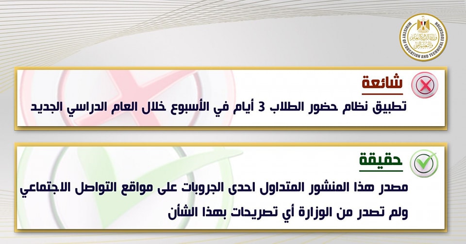 كما كشفت وزارة التربية والتعليم حقيقة تطبيق نظام حضور الطلاب 3 أيام في الأسبوع خلال العام الدراسي الجديد، مؤكدة أن تلك الأخبار مصدر جروبات مواقع التواصل الاجتماعي ولم يصدر من الوزارة أي قرار في هذا الشأن.