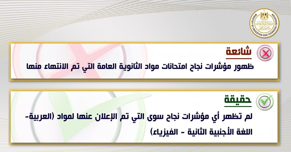 ونفت وزارة التعليم ظهور مؤشرات نجاح امتحانات مواد امتحانات الثانوية العامة التي تم الانتهاء منها، مؤكدة أنه لم تظهر أي مؤشرات نجاح سوى التي تم الإعلان عنها لمواد اللغة العربية واللغة الأجنبية الأولى والفيزياء.