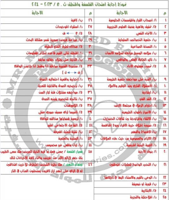 إجابة امتحان الفلسفة والمنطق ثانوية عامة 2024
