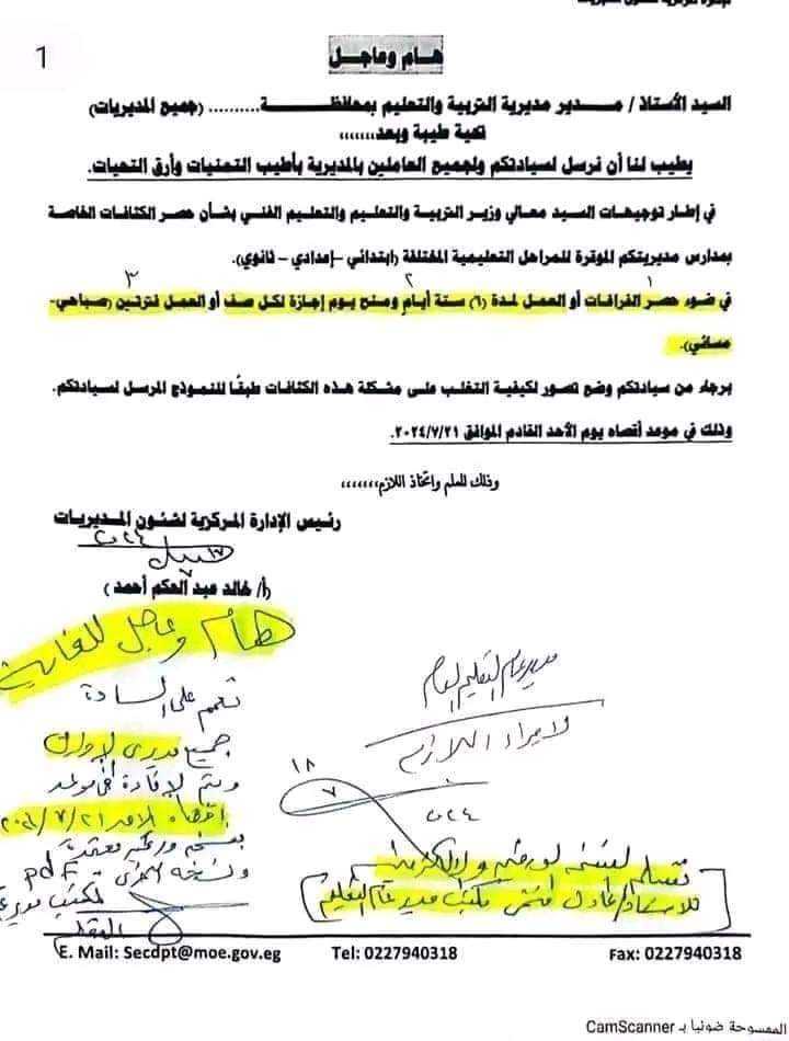وخاطبت وزارة التربية والتعليم والتعليم الفني جميع المديريات التعليمية بمختلف محافظات الجمهورية في إطار توجيهات وزير التربية والتعليم والتعليم الفني بشأن حصر الكثافات الخاصة بمدارس المحافظات للمراحل التعليمية المختلفة "ابتدائي واعدادي وثانوي"، وفي ضوء حصر الفراغات أو العمل لمدة 6 أيام ومنح يوم إجازة لكل صف أو العمل فترتين صباحي ومسائي برجاء وضع تصور لكيفية التغلب على مشكلة هذه الكثافات طبقا للنموذج المرسل إليكم وذلك في موعد أقصاه الاحد القادم 21 يوليو 2024.