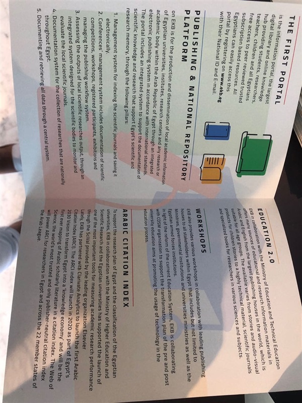 وتم وضع شاشة عرض كبيرة لبنك المعرفة لتمكن الحضور من الاطلاع عليه فى إصداره الثالث، وتعرض محتويات من النظام الدراسى لإدارة المواد التعليمة (كيمياء، رياضيات، فيزياء، وإحياء)، وعليه كتاب الوزارة بالإضافة إلى المحتوى الإضافى للدرس من كل الناشرين الدوليين (فيديوهات، وصور، وشرائح، وغيرها) تبسط المعلومة في المنهج الدراسى للطالب، وستكون متاحة للطالب من خلال التابلت، وهناك مواد تفاعلية ويختار اللغة سواء العربية والانجليزية، فضلاً عن معرفة كل المصادر المتاحة على بنك المعرفة من كبار الناشرين.