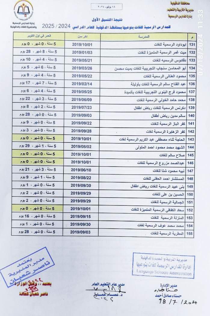 اعتمد ناصر شعبان وكيل وزارة التربية والتعليم بالدقهلية نتيجة التنسيق الاول للمستوى الأول رياض أطفال للمدارس الرسمية للغات للعام الدراسي 2024 / 2025.