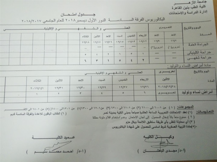 ننشر جدول امتحانات الفرقة السادسة بطب أزهر القاهرة
