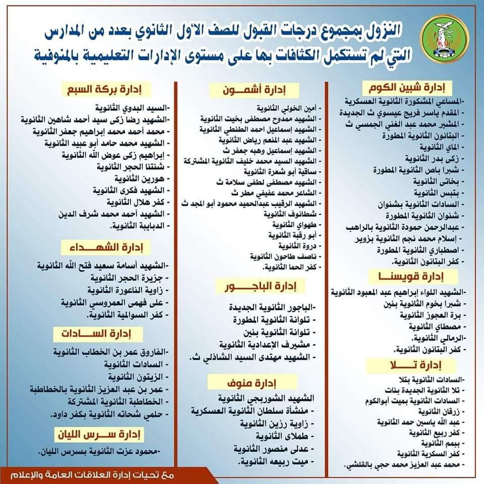 كما وافق المحافظ على النزولول للالتحاق بمرحلة الثانوي العام الخاص من 225 درجة إلى 220 درجة، والنزول بدرجات مجموع القبول للالتحاق بمرحلة الثانوي العام الخدمات من 220 درجة إلي 215 درجة.