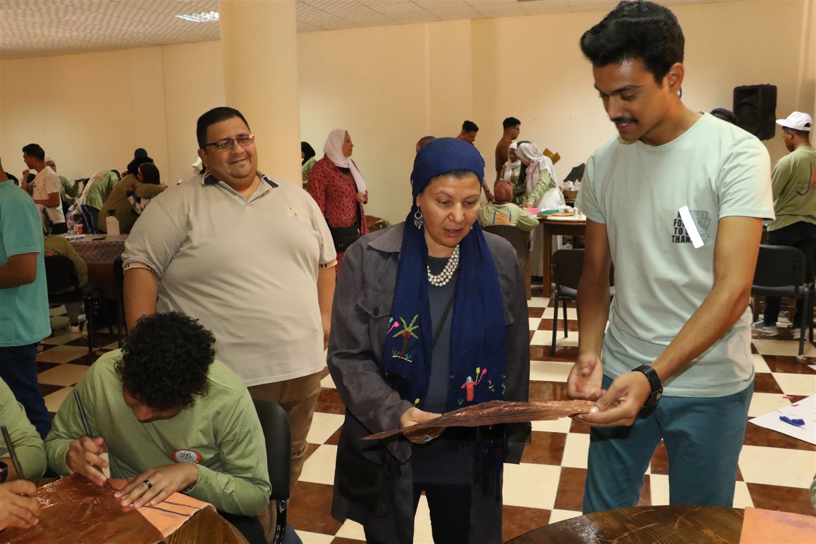 كما شهدت ورشة الرسم على الصدف للمدرب جلال عبد الخالق تدريب الشباب على تصميم أعمال مرتبطة بالبيئة البدوية ومنها لوحة لسيدة تسحب الماء من البئر، باستخدام النقش البارز.