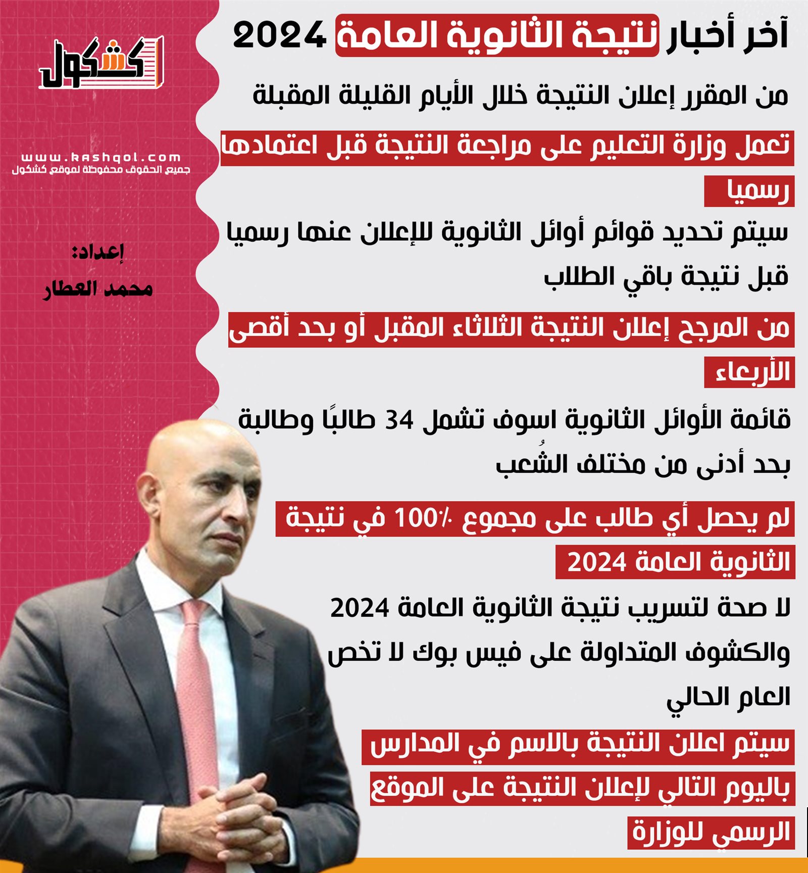 ومن بين آخر أخبار نتيجة الثانوية العامة 2024 أن وزارة التربية والتعليم والتعليم الفنى تعمل على مراجعة نتيجة الثانوية العامة 2024 قبل اعتمادها رسميا خلال الأيام القليلة المقبلة، كما أن موعد ظهور نتيجة الثانوية العامة 2024 لن يكون قبل يوم الاثنين ومن المرجح إعلان النتيجة الثلاثاء المقبل أو بحد أقصى الأربعاء، ةسيتم إعلان النتيجة بالاسم بالمدارس في اليوم التالي لإعلان نتيجة الثانوية العامة على الموقع الرسمي لوزارة التربية والتعليم.