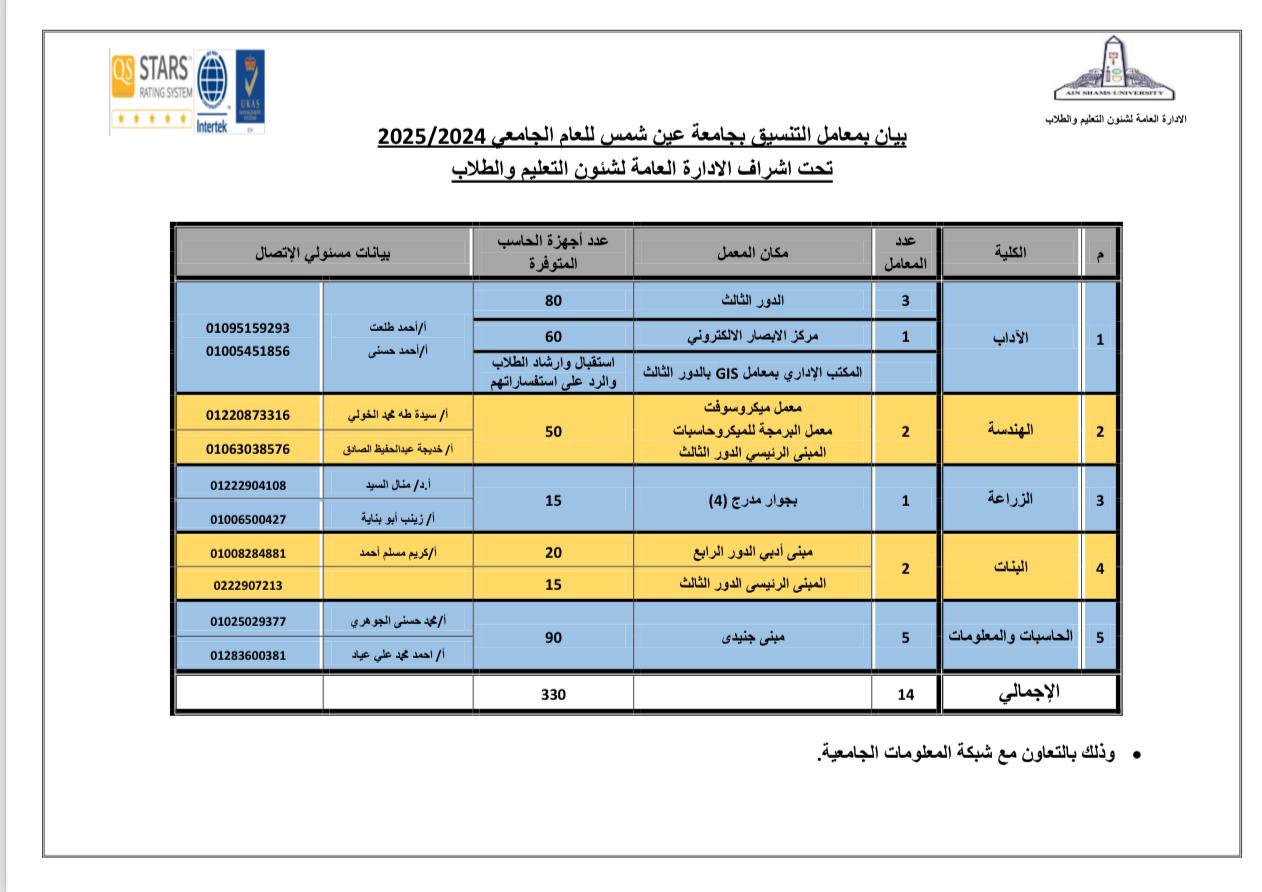 وجدير بالذكر أنه تم تخصيص أربعة معامل بكلية الآداب وخمسة معامل بكلية الحاسبات والمعلومات بالحرم الجامعي الرئيسي بالعباسية (امتداد الخليفية المأمون) ومقر آخر بكلية الهندسة يضم معملين للتنسيق في بميدان عبده باشا بالعباسية ومقر بكلية البنات بمصر الجديدة شارع الميرغني يضم معملين أخرين ومعمل بكلية الزراعة بشبرا الخيمة لإتاحة تسجيل الرغبات إلكترونيا من خلال موقع التنسيق الإلكتروني،