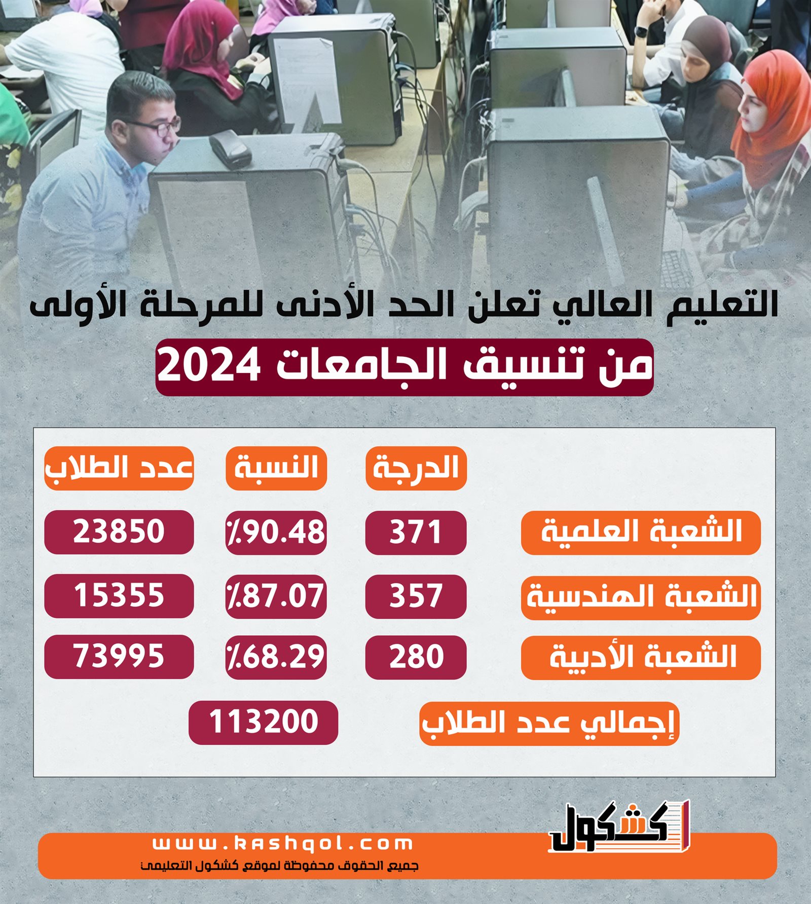 انفوجراف.. التعليم العالي تعلن الحد الأدنى للمرحلة الأولى لتنسيق الجامعات 2024