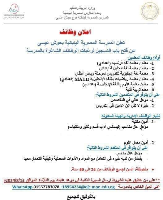 أعلنت المدرسة المصرية اليابانية بحوش عيسى، عن فتح باب التسجيل لرغبات الوظائف الشاغرة بالمدرسة والتي تضمنت الآتي:
