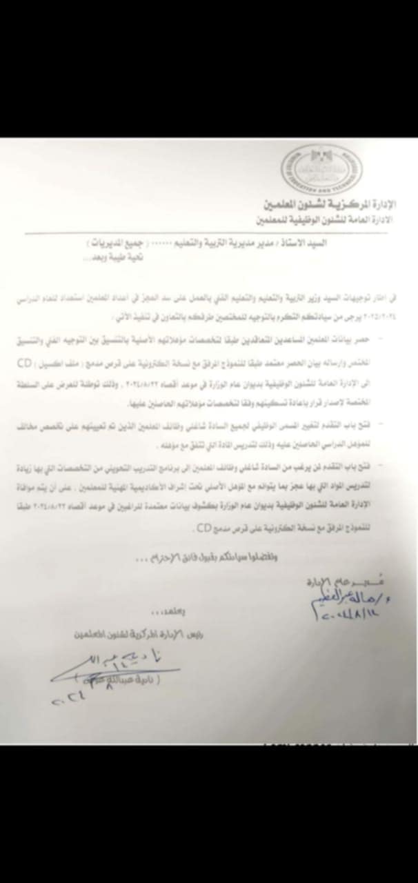 لتدريس المواد التي بها عجز بما يتوافق مع المؤهل الأصلي تحت إشراف الأكاديمية المهنية للمعلمين، على أن يتم موافاة الإدارة العامة للشئون الوظيفية بديوان عام الوزارة بكشوف بيانات معتمدة للراغبين في موعد اقتصاد ٢٠٢٤/٨/٢٢.