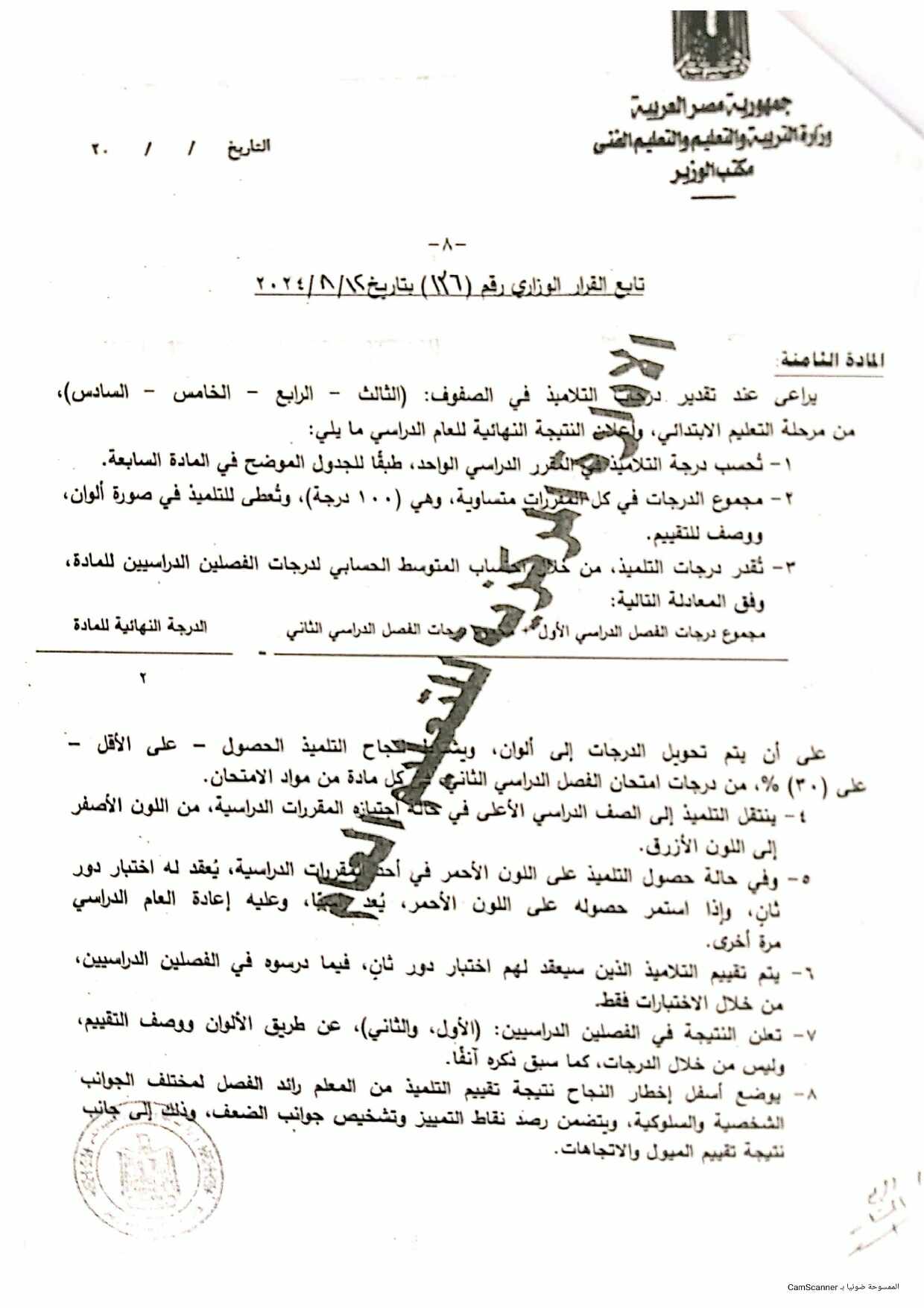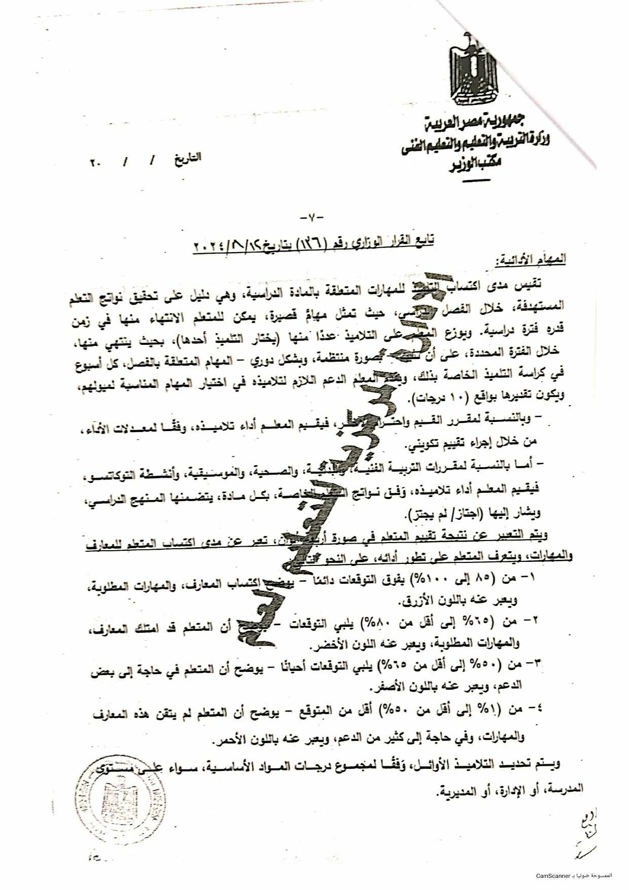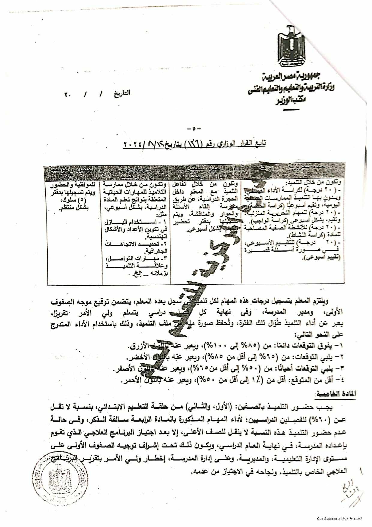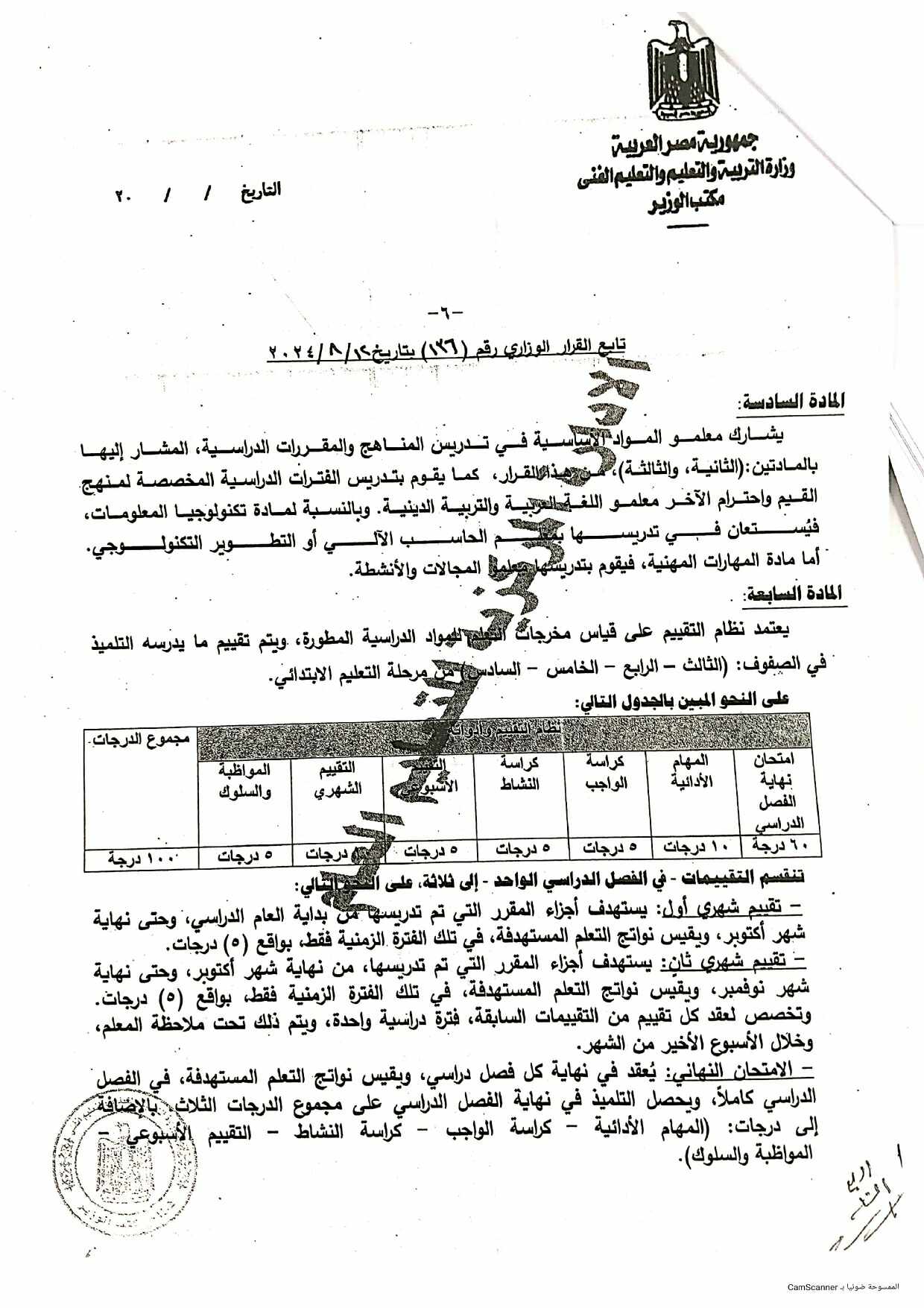 وشددت الوزارة في قرار وزاري لها، أنه يعتمد نظام التقييم على قياس مخرجات المواد الدراسية المطورة، ويتم تقييم ما يدرسه التلميذ في الصفوف الثالث- الرابع- الخامس- السادس، بمرحلة التعليم الابتدائي على النحو المبين التالي: