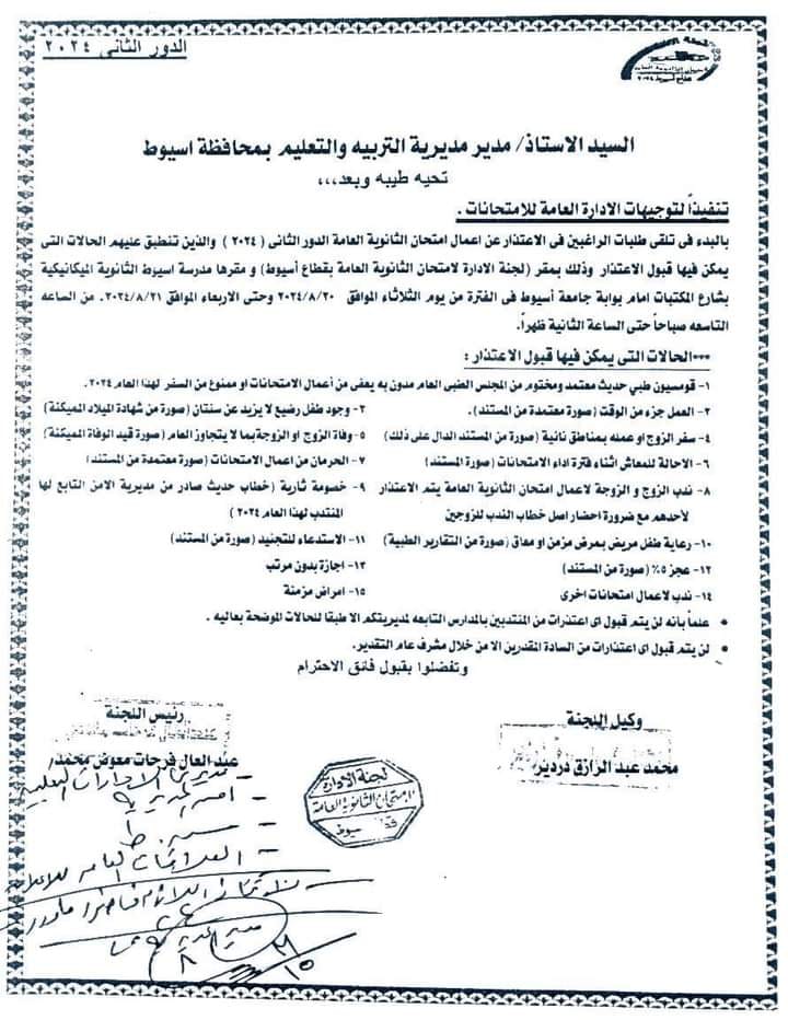 أعلنت وزارة التربية والتعليم والتعليم الفني، البدء في تلقى طلبات الراغبين في الاعتذار عن أعمال امتحان الثانوية العامة الدور الثانى ( ٢٠٢٤ ) والذين تنطبق عليهم الحالات التي يمكن فيها قبول الاعتذار وذلك بمقر لجنة الإدارة لامتحانات الثانوية العامة بقطاع أسيوط ومقرها مدرسة أسيوط الثانوية الميكانيكية بشارع المكتبات أمام بوابة جامعة أسيوط في الفترة من يوم الثلاثاء الموافق ٢٠٢٤/٨/٢٠ وحتى الأربعاء الموافق ٢٠٢٤/٨/٢١. من الساعة التاسعة صباحًا حتى الساعة الثانية ظهرًا.