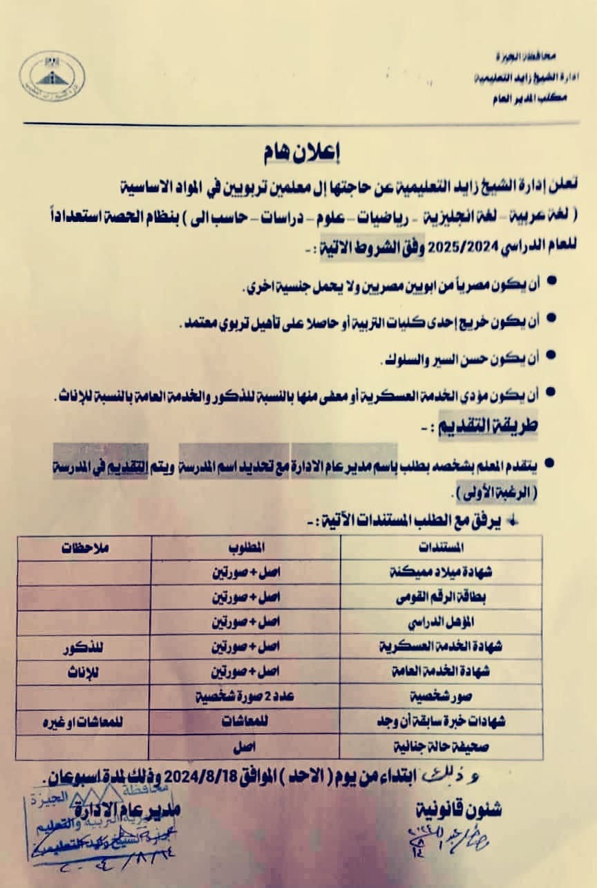 أعلنت إدارة الشيخ زايد التعليمية عن حاجتها إلى معلمين تربويين في المواد الأساسية (لغة عربية، لغة إنجليزية، رياضيات، علوم، دراسات، حاسب آلي) بنظام الحصة استعدادا للعام الدراسي 2024/2025 وفقا للآتي: