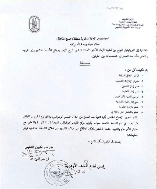 تكليف الوكيل الثقافى لكل منطقة، مع مدير إدارة الامتحانات ومدير التنسيق، ومدير إدارة المعلومات، وموجهى العموم لكل مخصص، ومدير إدارة الموارد البشرية، وعضو الادارة القانونية، لحضور الاجتماع الخاص بألية تنفيذ سد العجز من خلال الفيديو كونفراس.