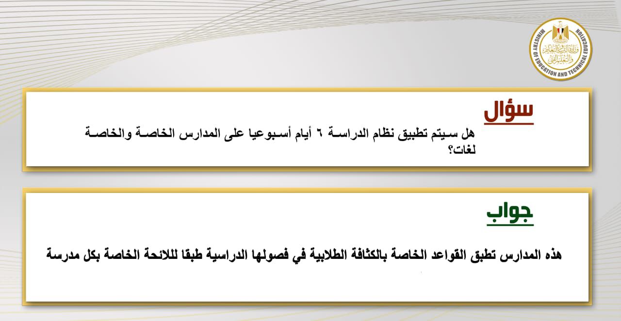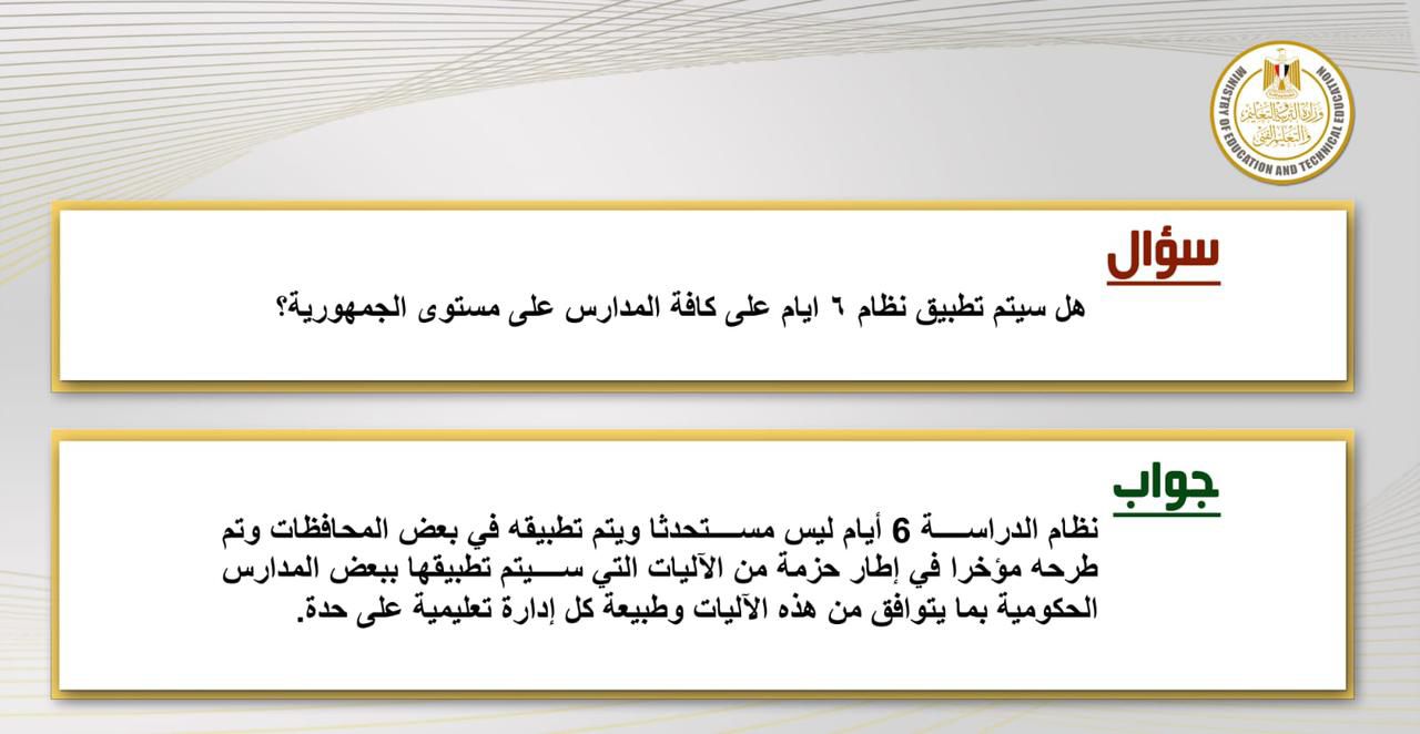 وشددت أن نظام الدراسة 6 أيام أسبوعيا ليس مستحدثا ويتم تطبيقه في بعض المحافظات وتم طرحه مؤخرا في إطار حزمة من الآليات التي سيتم تطبيقها ببعض المدارس الحكومية بما يتوافق من هذه الآليات وطبيعة كل إدارة تعليمية على حدة.