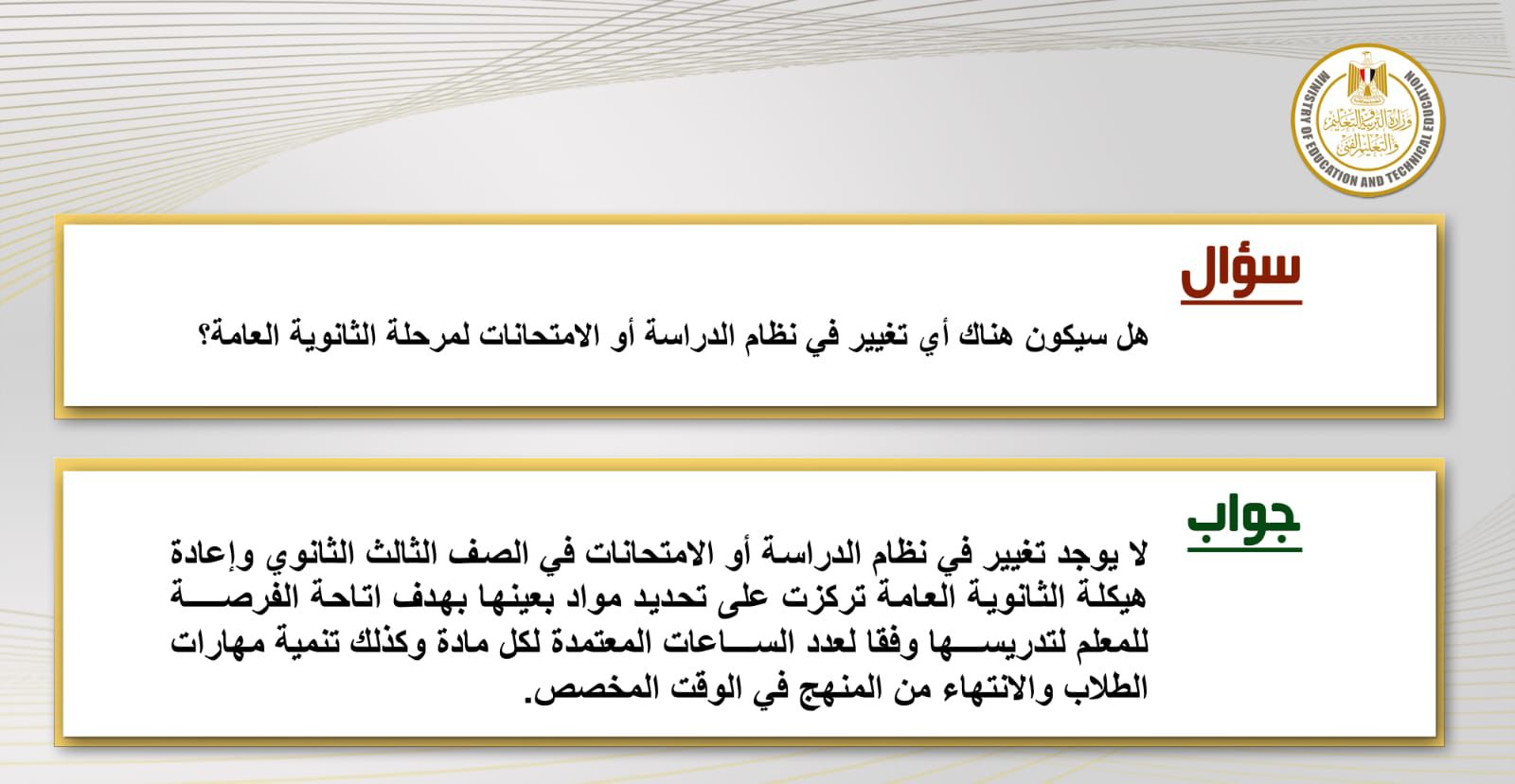حيث أوضحت ردا على سؤال هل سيكون هناك أي تغيير في نظام الدراسة أو الامتحانات لمرحلة الثانوية العامة؟، بأنه لا يوجد تغيير في نظام الدراسة أو الامتحانات في الصف الثالث الثانوي وإعادة هيكلة الثانوية العامة تركزت على تحديد مواد بعينها بهدف اتاحة الفرصة للمعلم لتدريسها وفقا لعدد الساعات المعتمدة لكل مادة وكذلك تنمية مهارات الطلاب والانتهاء من المنهج في الوقت المخصص.