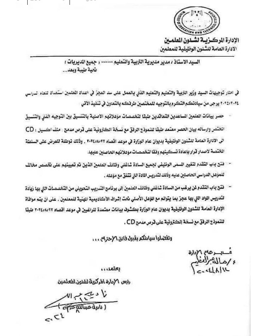 وحسب نص الخطاب، ففي إطار توجيهات وزير التربية والتعليم والتعليم الفني، بالعمل على سد العجز في أعداد المعلمين استعداد للعام الدراسي 2024-2025، يرجى التكرم بالتوجيه للمختصين طرفكم بالتعاون في تنفيذ الآتي: