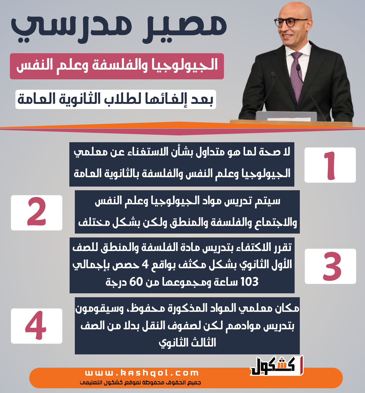 إنفوجراف.. 4 معلومات تكشف مصير مدرسي الجيولوجيا والفلسفة وعلم النفس بعد إلغائها لطلاب 3 ثانوي