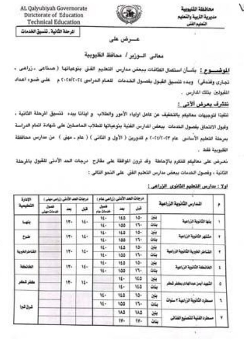 وافق المهندس أيمن عطية محافظ القليوبية على ما جرى عرضه من سماح إبراهيم وكيل وزارة التربية والتعليم بالقليوبية، بشأن تخفيض الحد الأدنى للقبول ببعض مدارس التعليم الفني بنوعياتها (صناعي - زراعي- تجاري- فندقي).