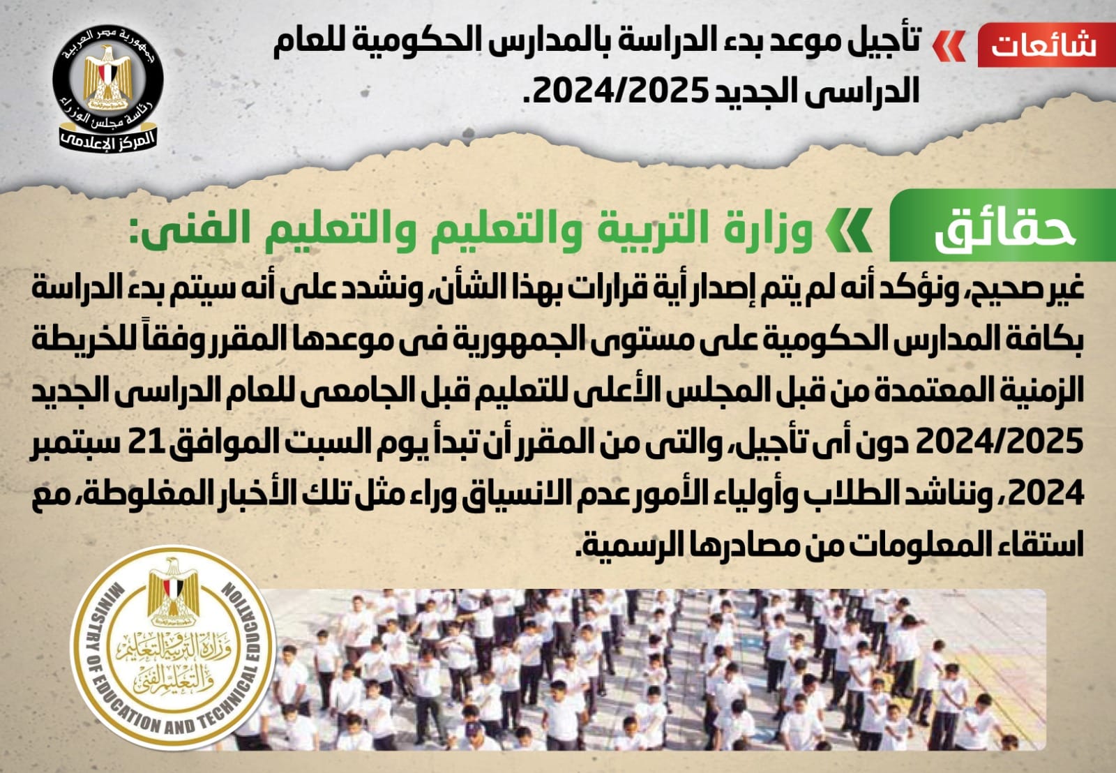 تداولت بعض صفحات التواصل الاجتماعي أنباء بشأن تأجيل موعد بدء الدراسة بالمدارس الحكومية للعام الدراسي الجديد 2024/2025، وقد قام المركز الإعلامي لمجلس الوزراء بالتواصل مع وزارة التربية والتعليم والتعليم الفني، والتي نفت تلك الأنباء.
