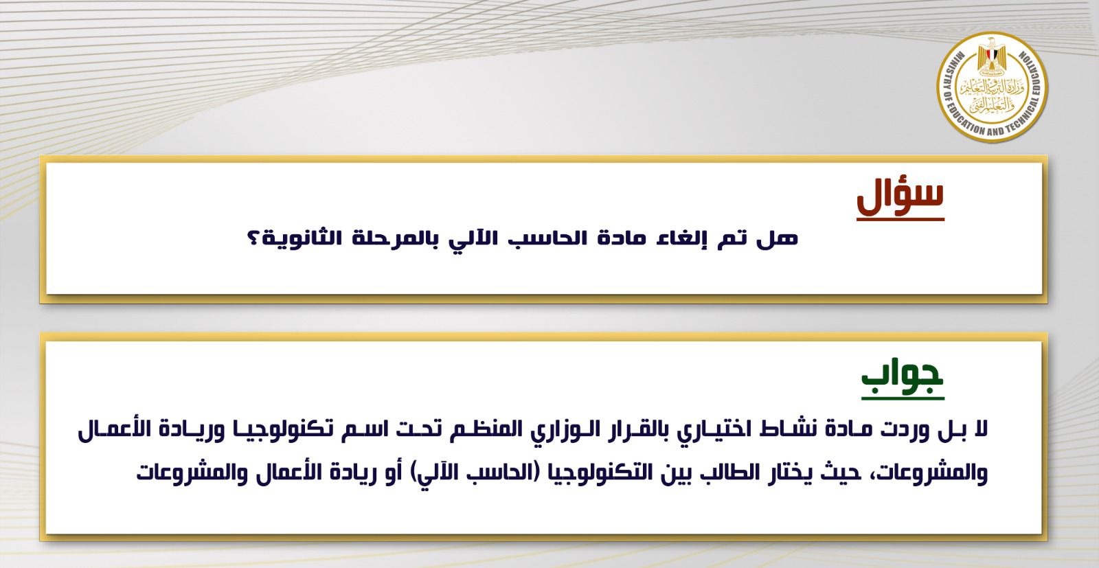 وأكدت وزارة التربية والتعليم، أنه لم يتم إلغاء مادة الحاسب الآلي، بل وردت كمادة نشاط اختياري بالقرار الوزاري المنظم تحت اسم تكنولوجيا وريادة الأعمال والمشروعات.
