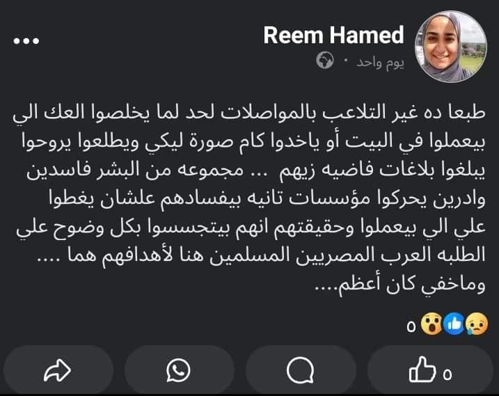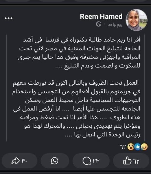 وكانت الباحثة المصرية، نشرت بلاغا عبر صفحتها على فيسبوك إلى الجهات الأمنية في مصر، وكتبت: "أقر أنا ريم حامد طالبة دكتوراه في فرنسا في أشد الحاجة للتبليغ للجهات المعنية في مصر.. لأني تحت المراقبة وأجهزتي مخترقة.. وفوق هذا حاليًا يتم جبري للسكوت والصمت وعدم التبليغ".