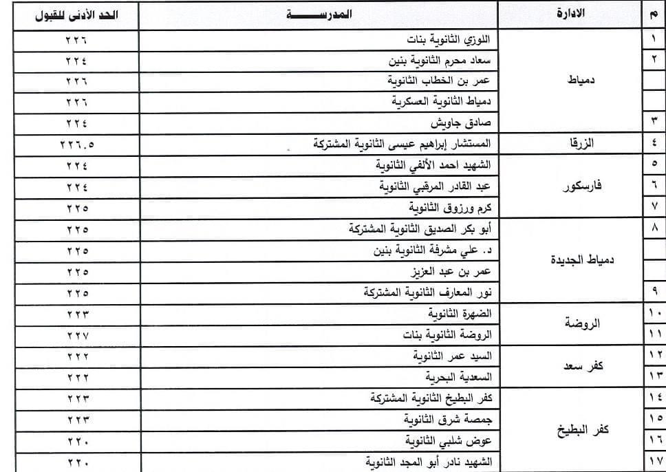 أولًا بإدارة دمياط التعليمية، تم النزول بالحد الأدنى للقبول بمدارس اللوزي الثانوية بنات وعمر بن الخطاب الثانوية بنات ودمياط الثانوية العسكرية إلى مجموع ٢٢٦ درجة، و مدرستى سعاد محرم الثانوية بنين وصادق جاويش بمجموع ٢٢٤ درجة.