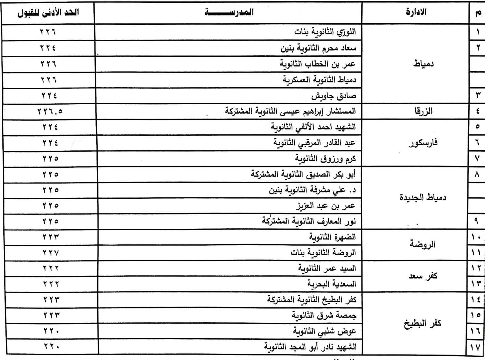 وبادارة الزرقا التعليمية فقد تم النزول بالحد الأدنى للقبول بمدرسة المستشار ابراهيم عيسى الثانوية المشتركة إلى مجموع ٢٢٦.٥ درجة، وبادارة فارسكور تم النزول بالحد الأدنى للقبول بمدرستى الشهيد أحمد الألفى الثانوية وعبد القادر المرقبى الثانوية إلى مجموع ٢٢٤ درجة، و مدرسة كرم ورزوق إلى مجموع ٢٢٥ درجة.