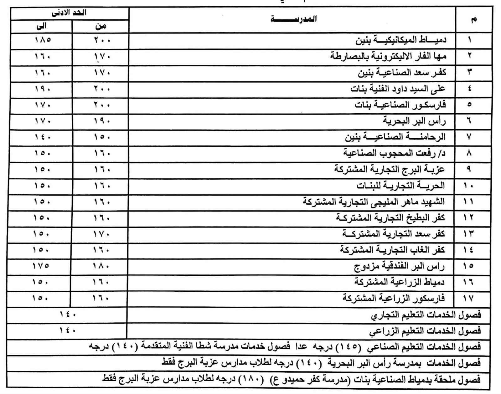 هذا وقد وافق " محافظ دمياط " أيضًا على النزول بالحد الأدنى للقبول بفصول الخدمات بالثانوي العام من مجموع ٢٠٠ درجة إلى مجموع ١٩٠ درجة.
