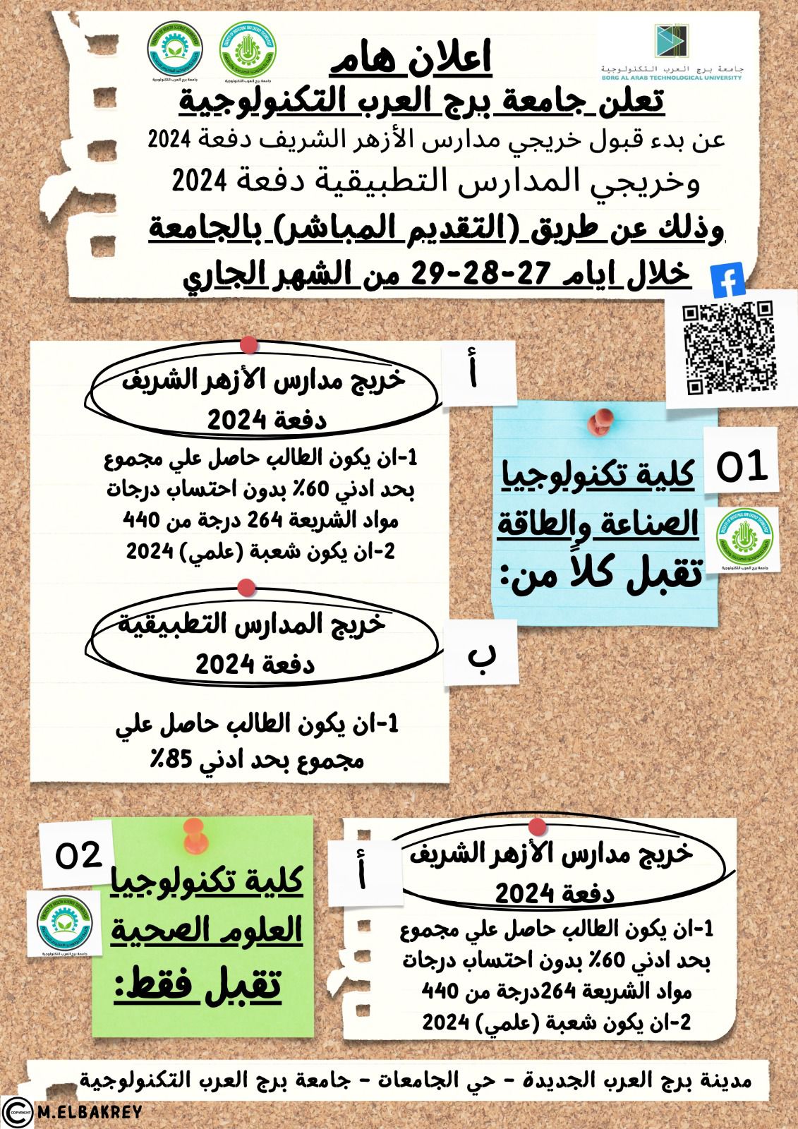 جامعة برج العرب التكنولوجية تعلن عن قبول دفعة جديدة من طلاب الأزهر والمدارس التطبيقية دفعة 2024