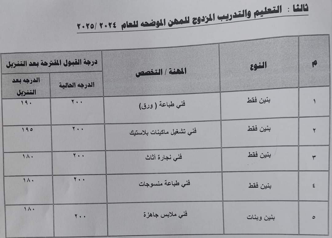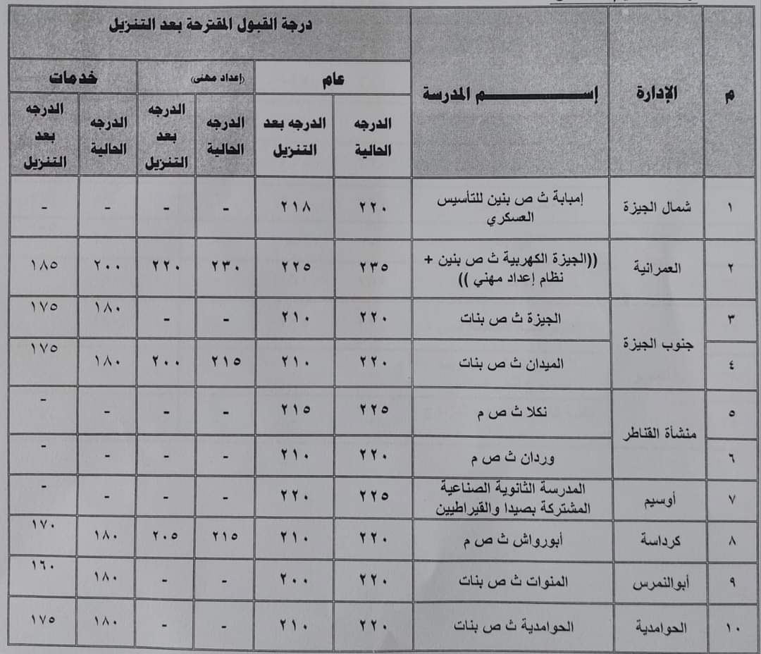 كما اعتمد محافظ الجيزة تخفيض درجات القبول ببعض المدارس الفنية وبيانها وفقًا للجدول المرفقة.