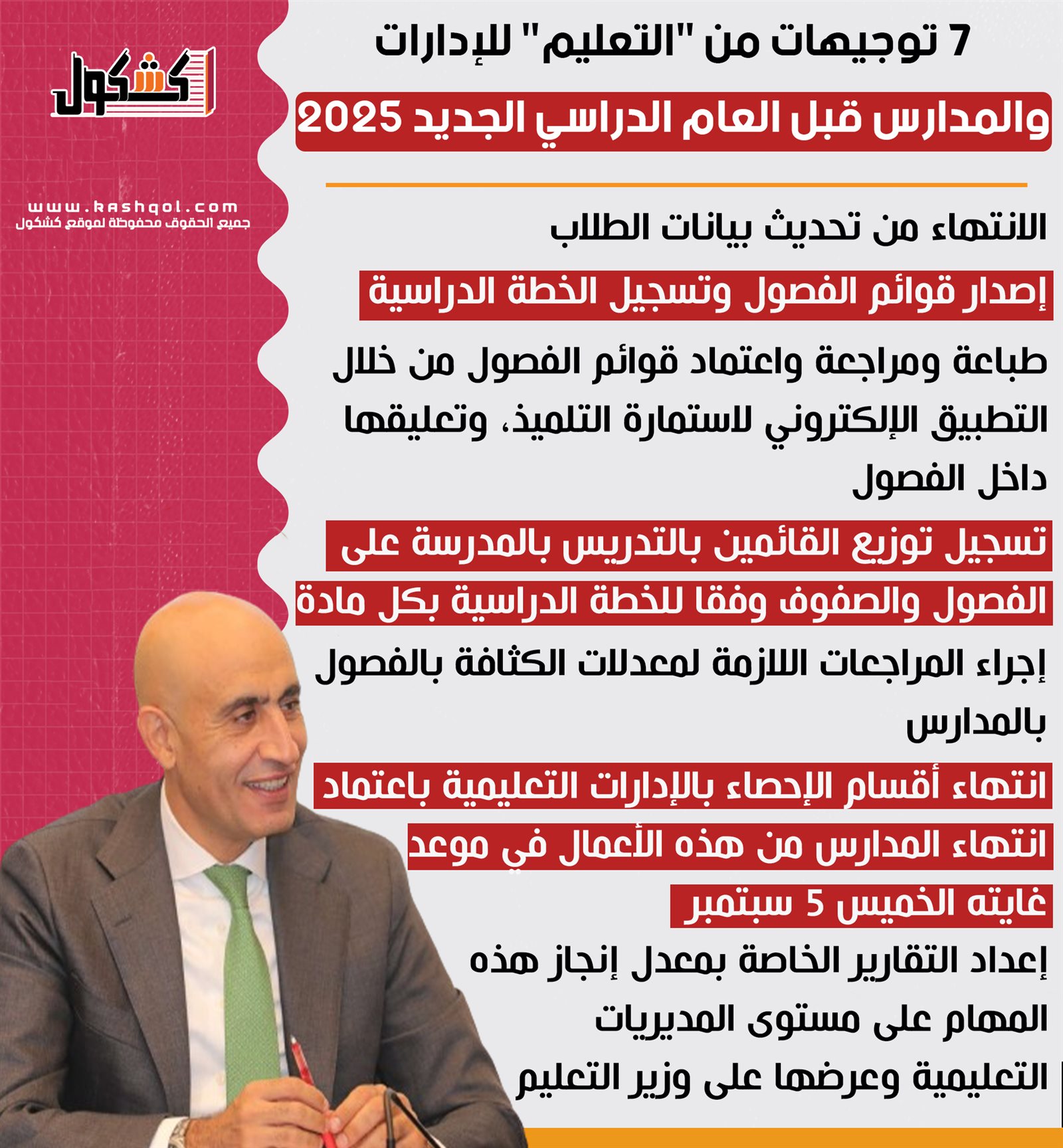 إنفوجراف.. 7 توجيهات من "التعليم" للإدارات والمدارس قبل العام الدراسي الجديد 2025