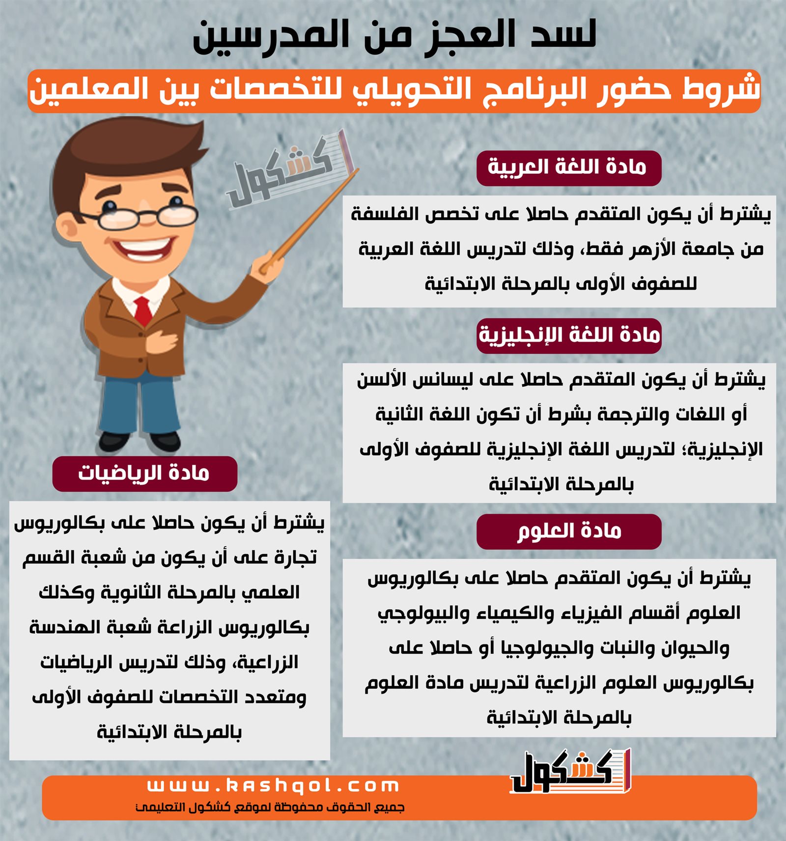 - بالنسبة لمادة الرياضيات يشترط أن يكون حاصلا على بكالوريوس تجارة على أن يكون من شعبة القسم العلمي بالمرحلة الثانوية وكذلك بكالوريوس الزراعة شعبة الهندسة الزراعية، وذلك لتدريس الرياضيات ومتعدد التخصصات للصفوف الأولى بالمرحلة الابتدائية.