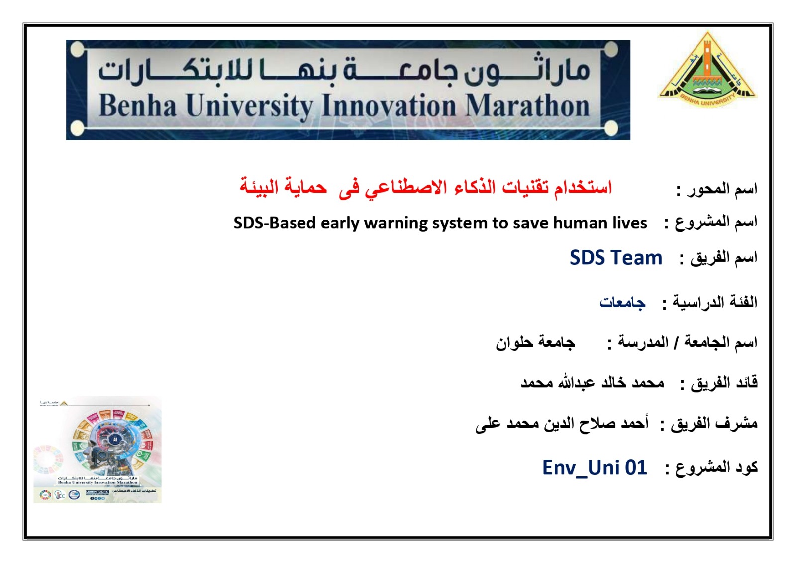 وقد حقق فريق "SDS" إنجازًا مشرفًا بفوزه بالمركز الأول في مسار حماية البيئة، وتكون الفريق من الطلاب من كلا من، محمد خالد، مهاب ياسر، مصطفى فوزى، معاذ محمود.