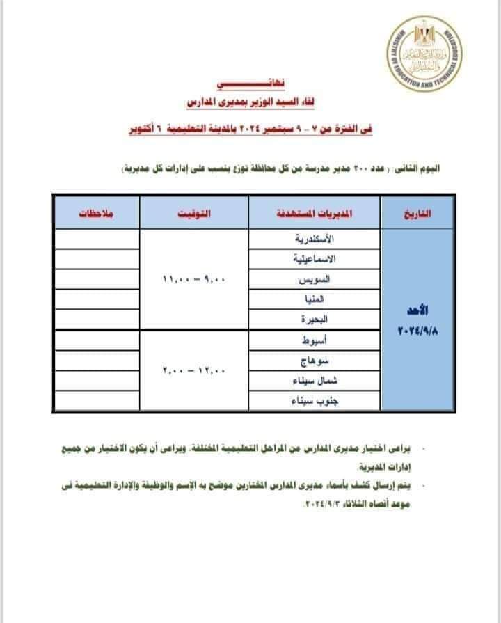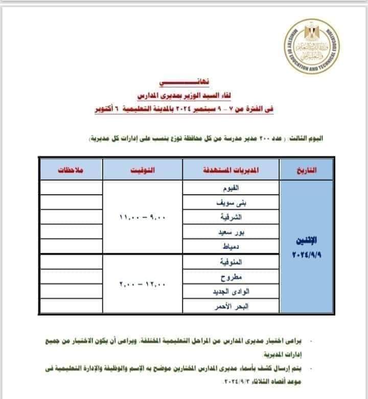 ووجه وزير التربية والتعليم بأن يتم إرسال كشف بأسماء مديري المدارس المختارين موضح به الإسم والوظيفة والإدارة التعليمية في موعد أقصاه الثلاثاء ٢٠٢٤/٩/٣.