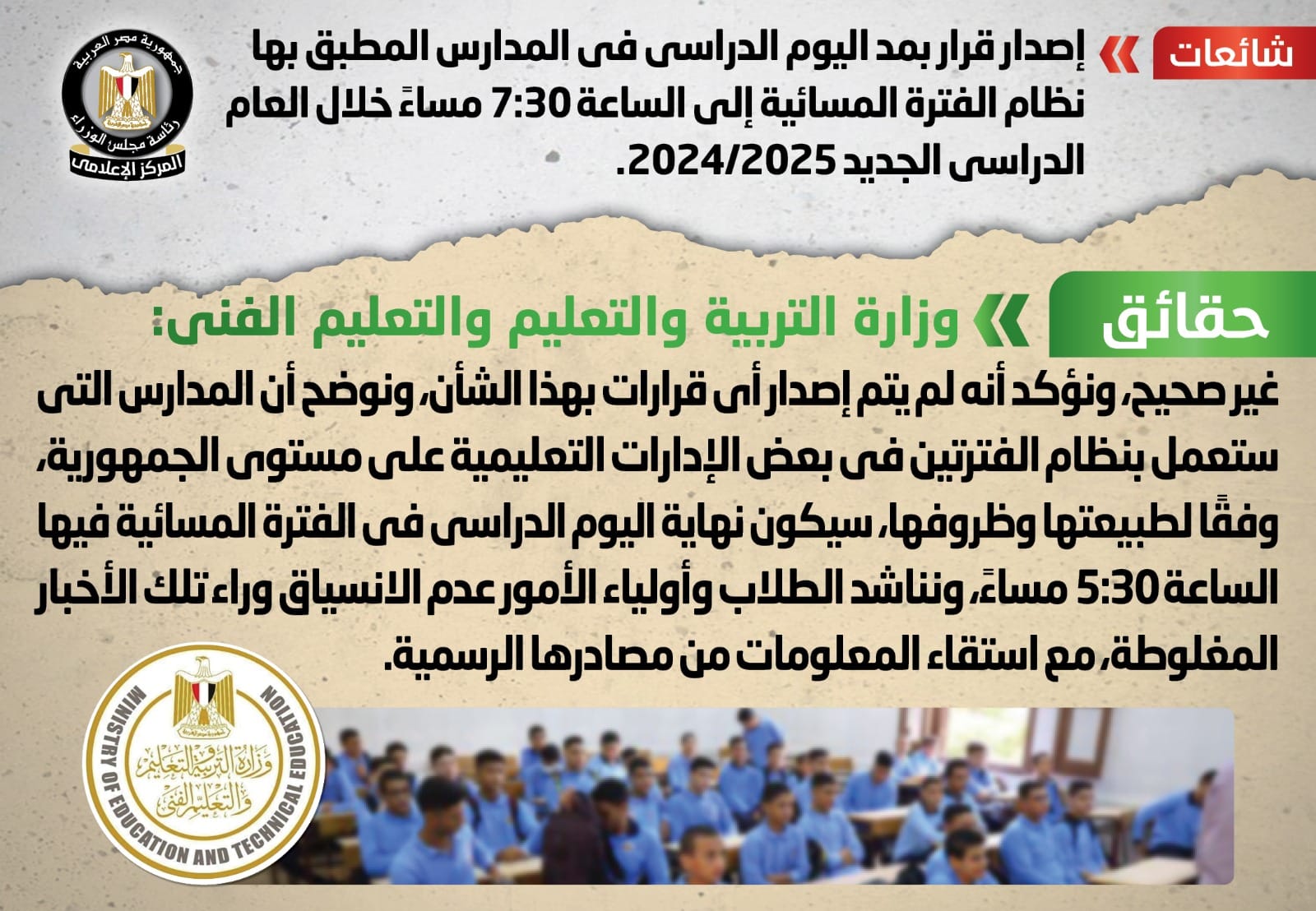 حيث تداولت بعض صفحات التواصل الاجتماعي أنباء بشأن إصدار قرار بمد اليوم الدراسي في المدارس المطبق بها نظام الفترة المسائية إلى الساعة 7:30 مساءً خلال العام الدراسي الجديد 2024/2025.