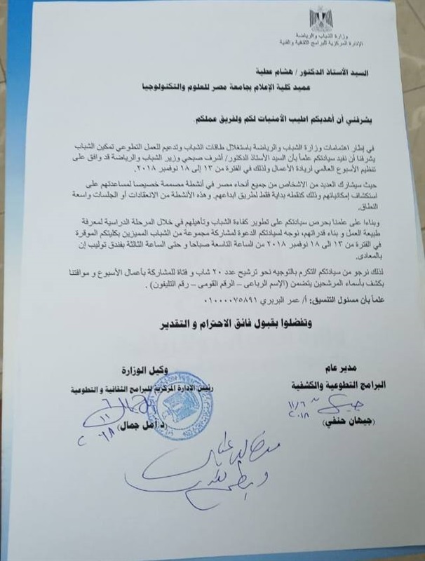 أعلن الدكتور هشام عطية، عميد كلية الإعلام بجامعة مصر للعلوم والتكنولوجيا، مشاركة الكلية بالأسبوع العالمي لريادة الأعمال، المنظم من قبل وزارة الشباب والرياضة برئاسة أشرف صبحي، خلال الفترة 13-18 نوفمبر 2018، من التاسعة صباحًا وحتى 3 عصرًا، بإحدى الفنادق الكبرى بالقاهرة.