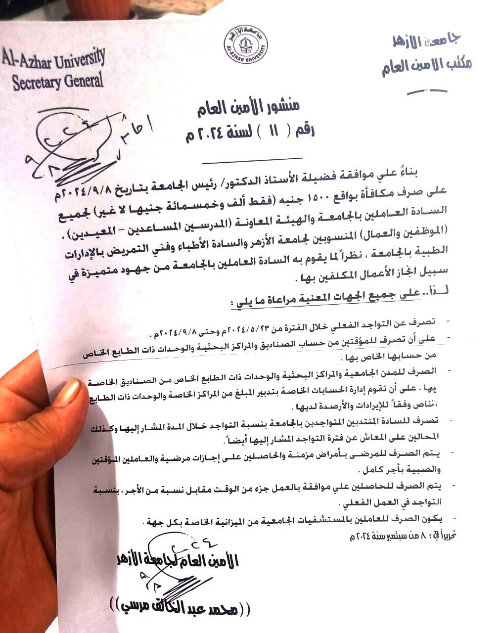 وجاء نص القرار كالتالي: بناءً على موافقة على صرف مكافأة بواقع 1500 جنيه فقط لا غير لجميع العاملين بالجامعة الموظفين والعمال والمدرسين المساعدين والمعيدين، نظير الجهود المميزة في إنجاز المهام المطلوبة منهم، لذا على جميع الجهات المعنية مراعاة ما يلي: