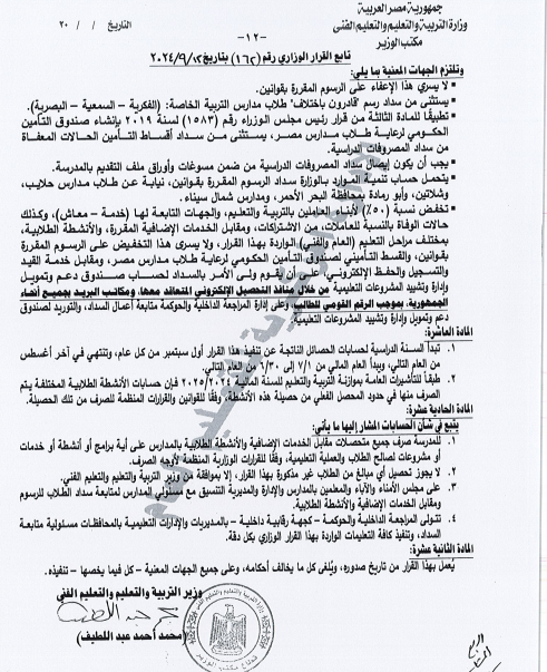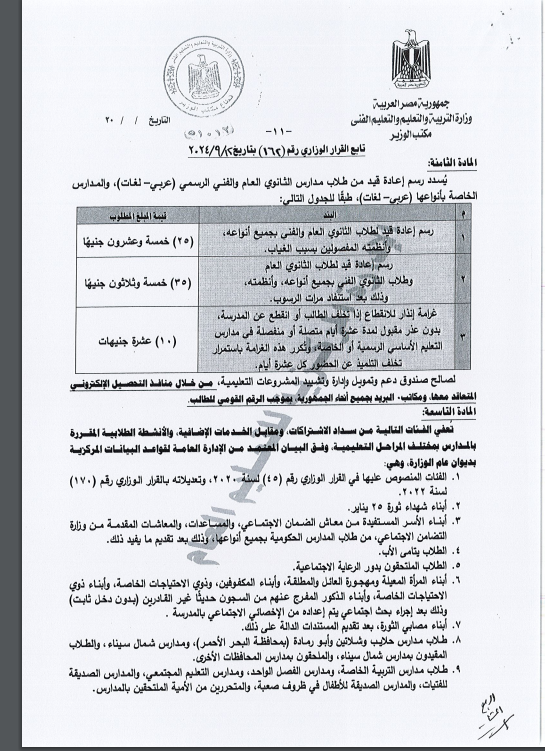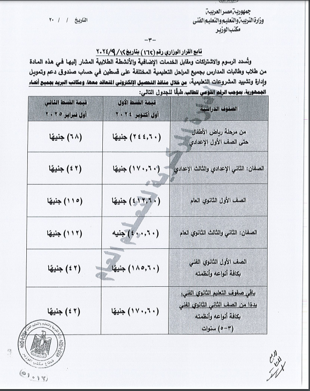 - لا يجوز تحصيل أي مبالغ من الطلاب غير مذكورة بهذا القرار، إلا بموافقة من وزير التربية والتعليم والتعليم الفني.