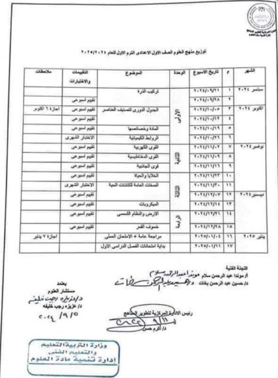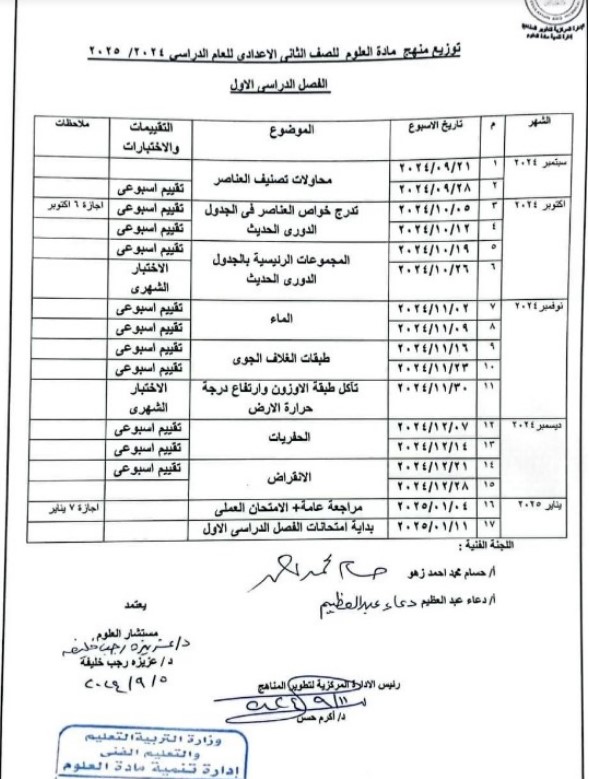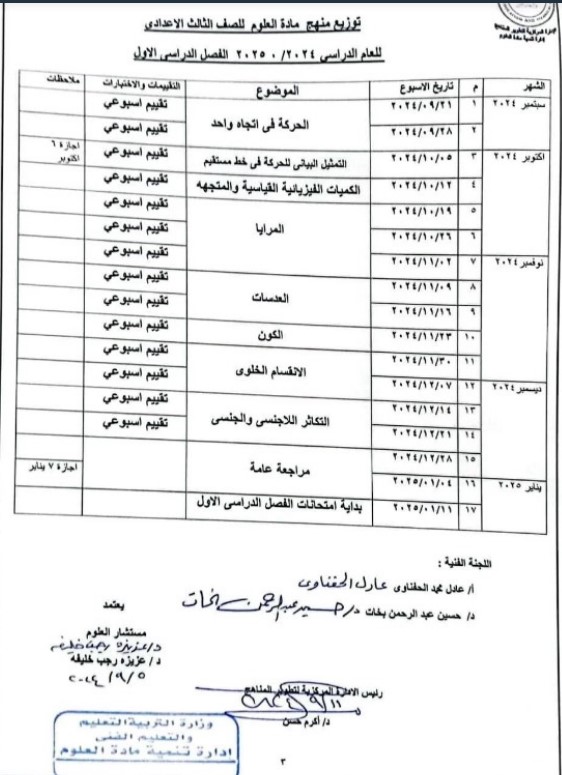 عاجل| توزيع منهج العلوم الفصل الدراسي الأول للمرحلة الإعدادية 2025